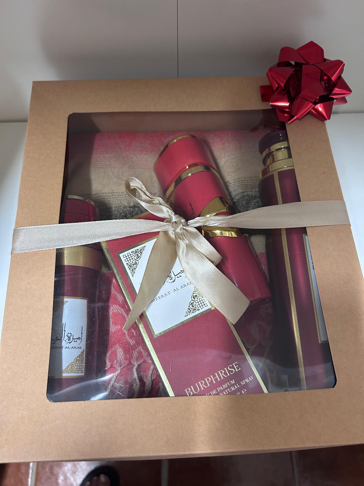 Caja de regalo ameerat al arab rosa, compuesto por perfume 100ml de purprhise version economica y desodorante y ambientador lataffa. un regalo perfectos para estas navidades