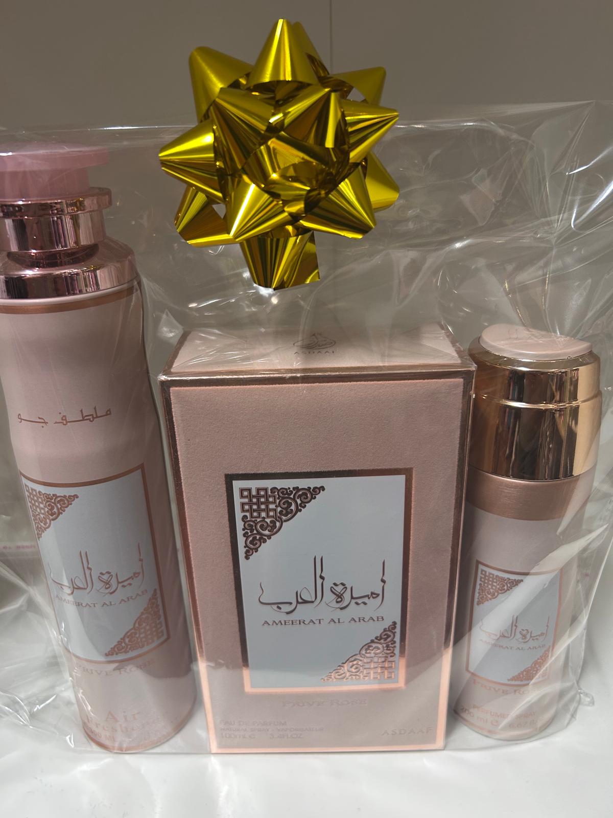 Caja de regalo ameerat al arab rosa, compuesto por perfume 100ml de lataffa y desodorante y ambientador. un regalo perfectos para estas navidades