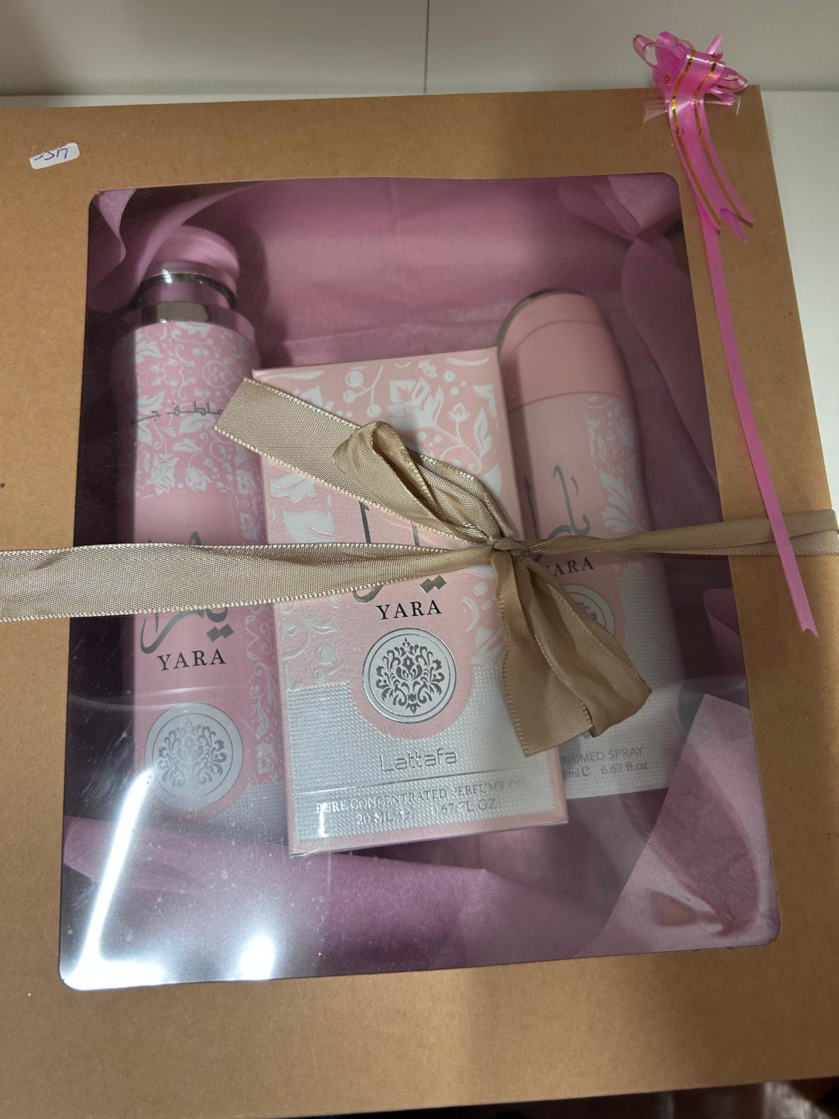 Caja de regalo Yara rosa en aceite 25ml, con su barita perfume muy concentrado,desodorante y ambientador todo de la casa lataffa