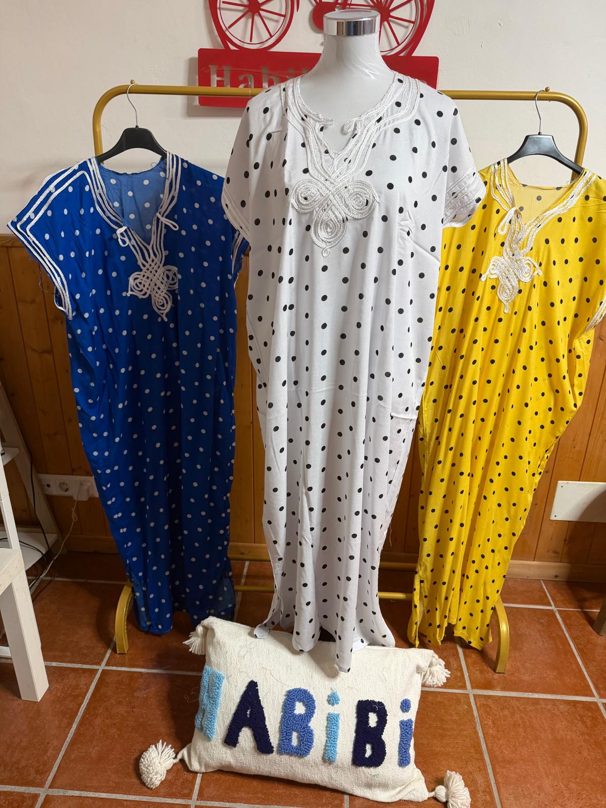 Kandora de Lunares talla unica desde una 32 hasta una 48. medidas de sisa a sisa 68CM. Al ser totalmente recta mide de pecho,cintura y cadera igual largo 1,22CM.