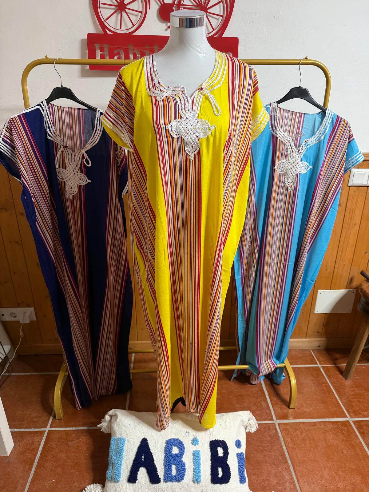 Kandora de rayas talla unica desde una 32 hasta una 48. medidas de sisa a sisa 66CM. Al ser totalmente recta mide de pecho,cintura y cadera igual largo 1,22CM.
