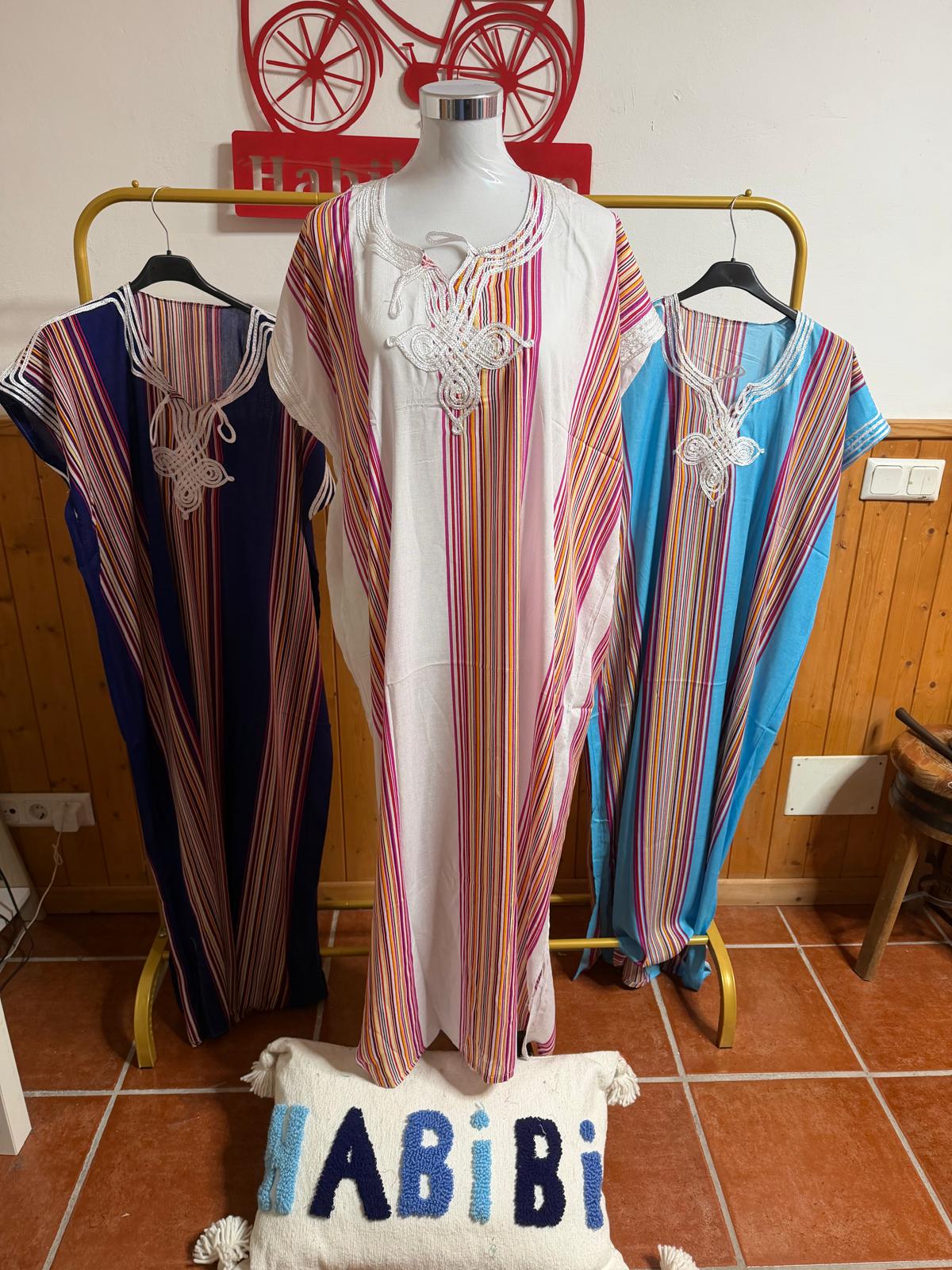 Kandora de rayas talla unica desde una 32 hasta una 48. medidas de sisa a sisa 66CM. Al ser totalmente recta mide de pecho,cintura y cadera igual largo 1,22CM.