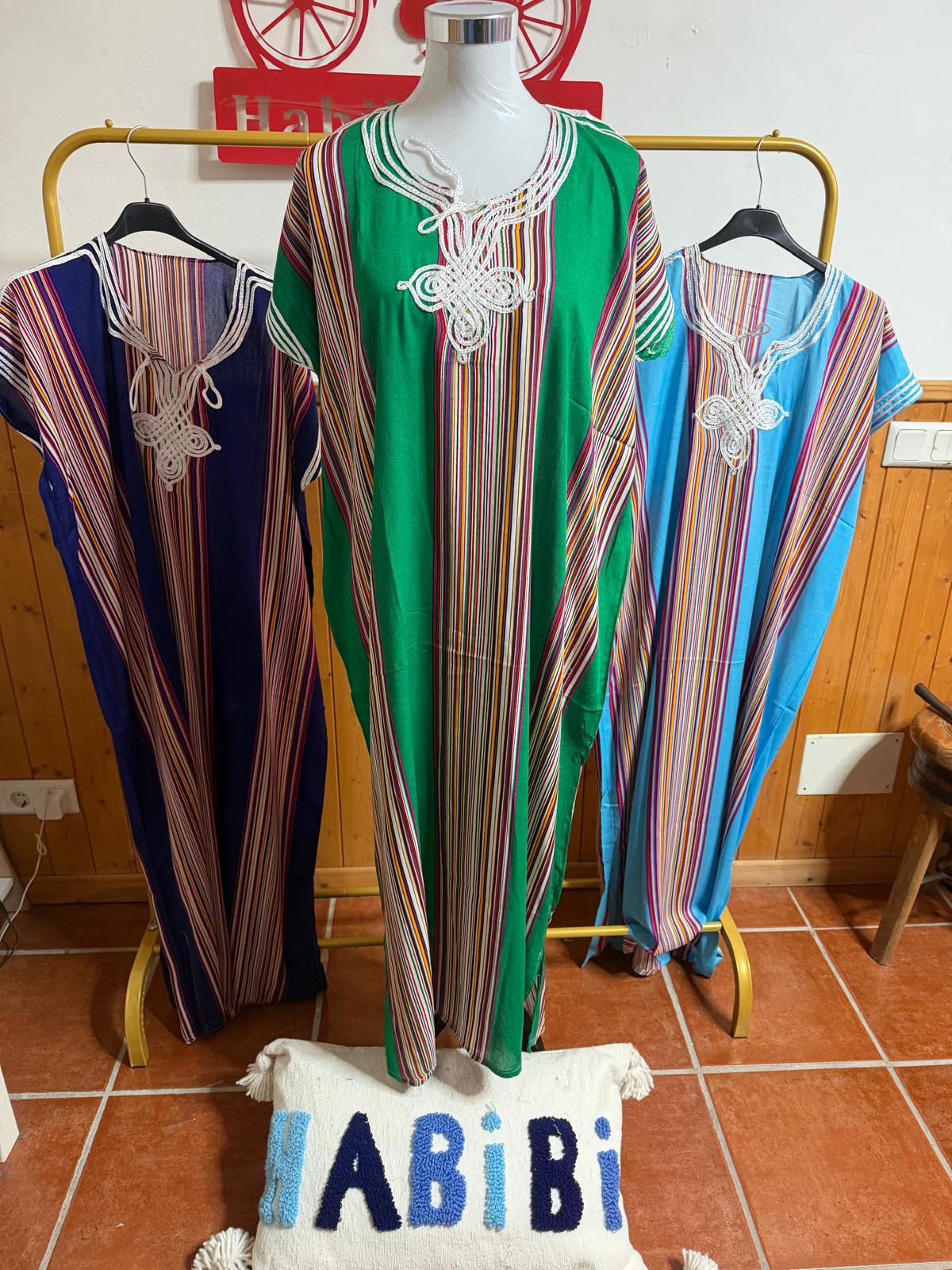 Kandora de rayas  talla unica desde una 32 hasta una 48. medidas de sisa a sisa 66CM. Al ser totalmente recta mide de pecho,cintura y cadera igual largo 1,22CM.
