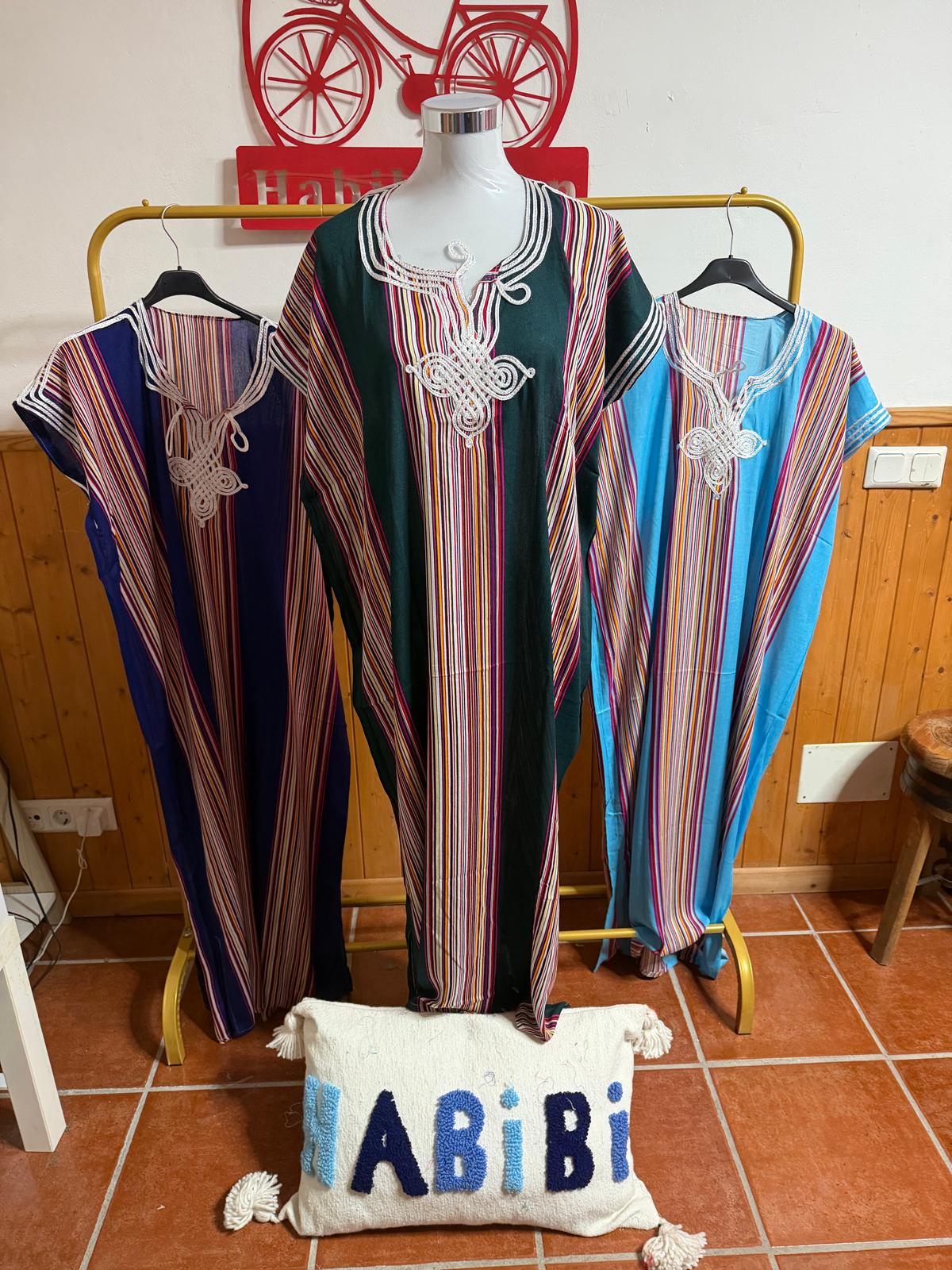 Kandora de rayas  talla unica desde una 32 hasta una 48. medidas de sisa a sisa 66CM. Al ser totalmente recta mide de pecho,cintura y cadera igual largo 1,22CM.