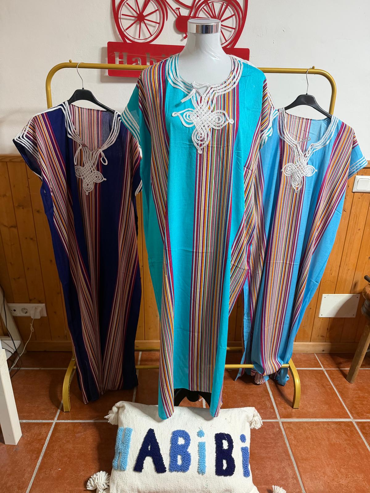 Kandora de rayas talla unica desde una 32 hasta una 48. medidas de sisa a sisa 66CM. Al ser totalmente recta mide de pecho,cintura y cadera igual largo 1,22CM.